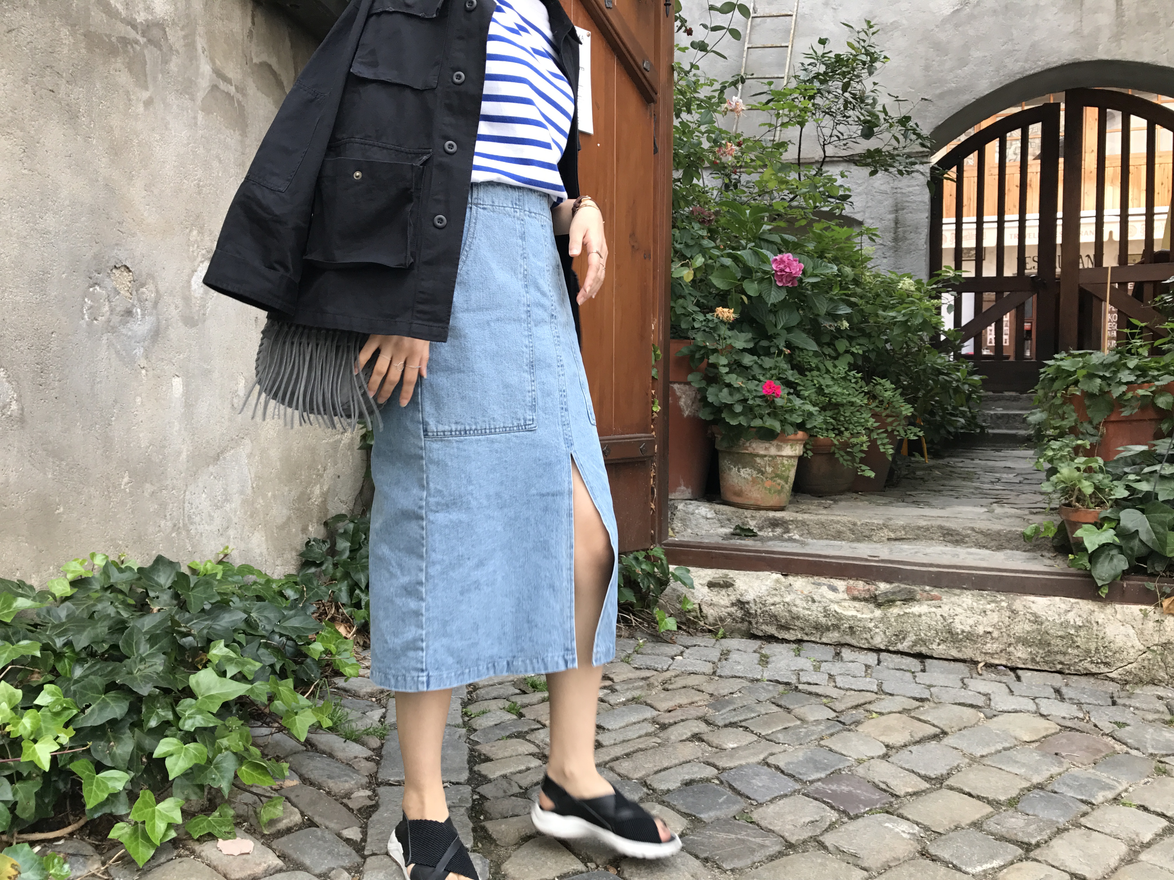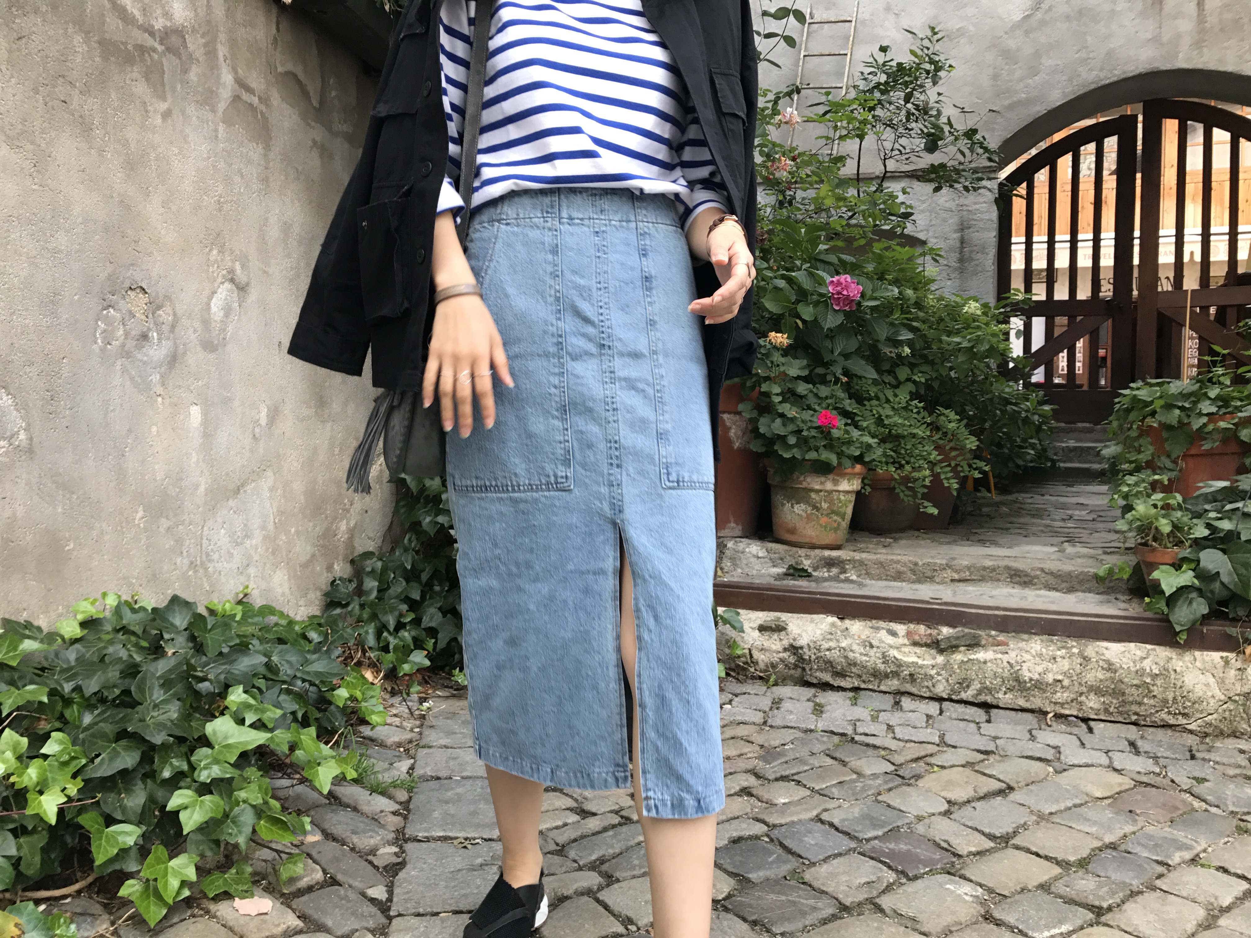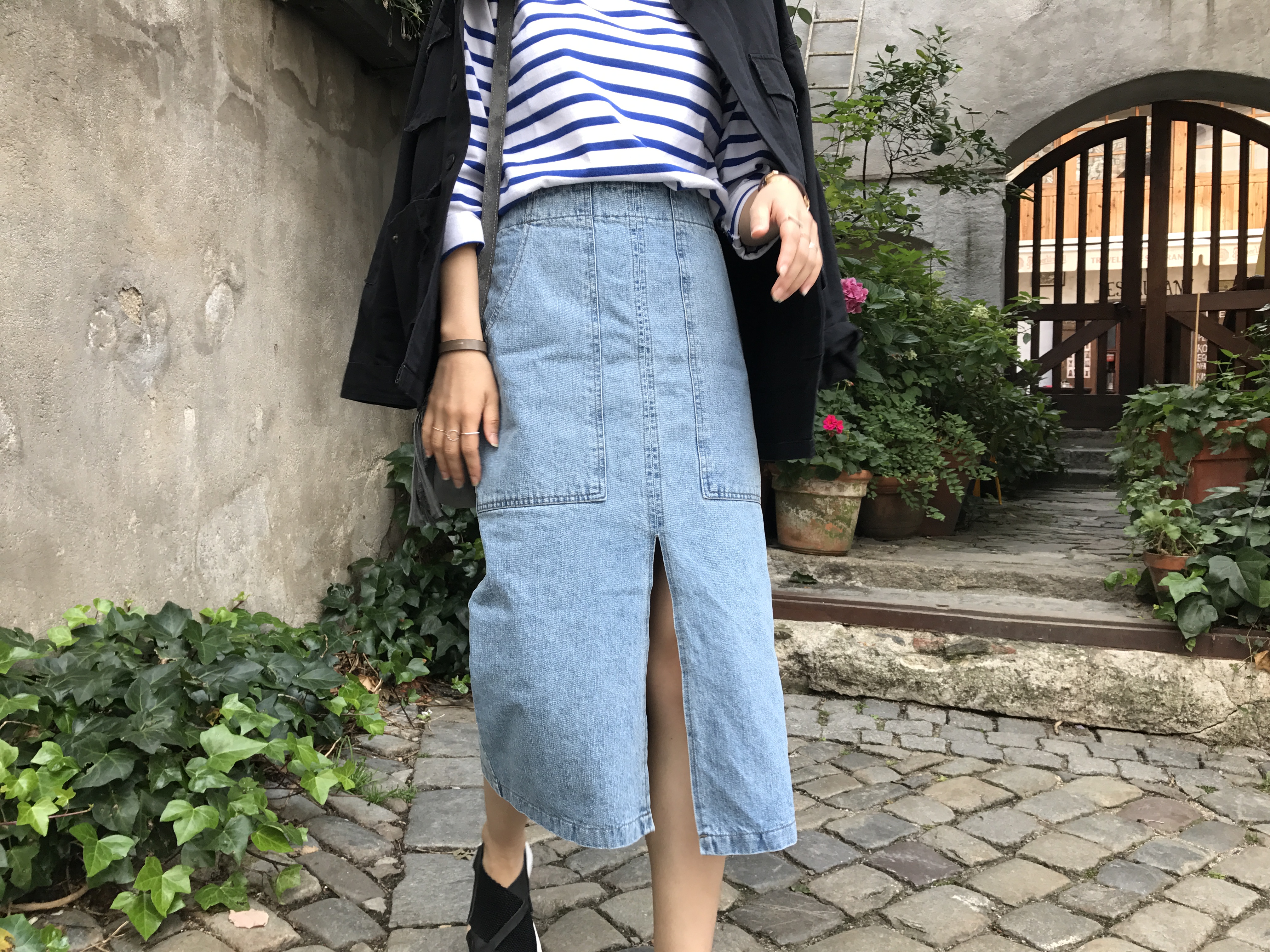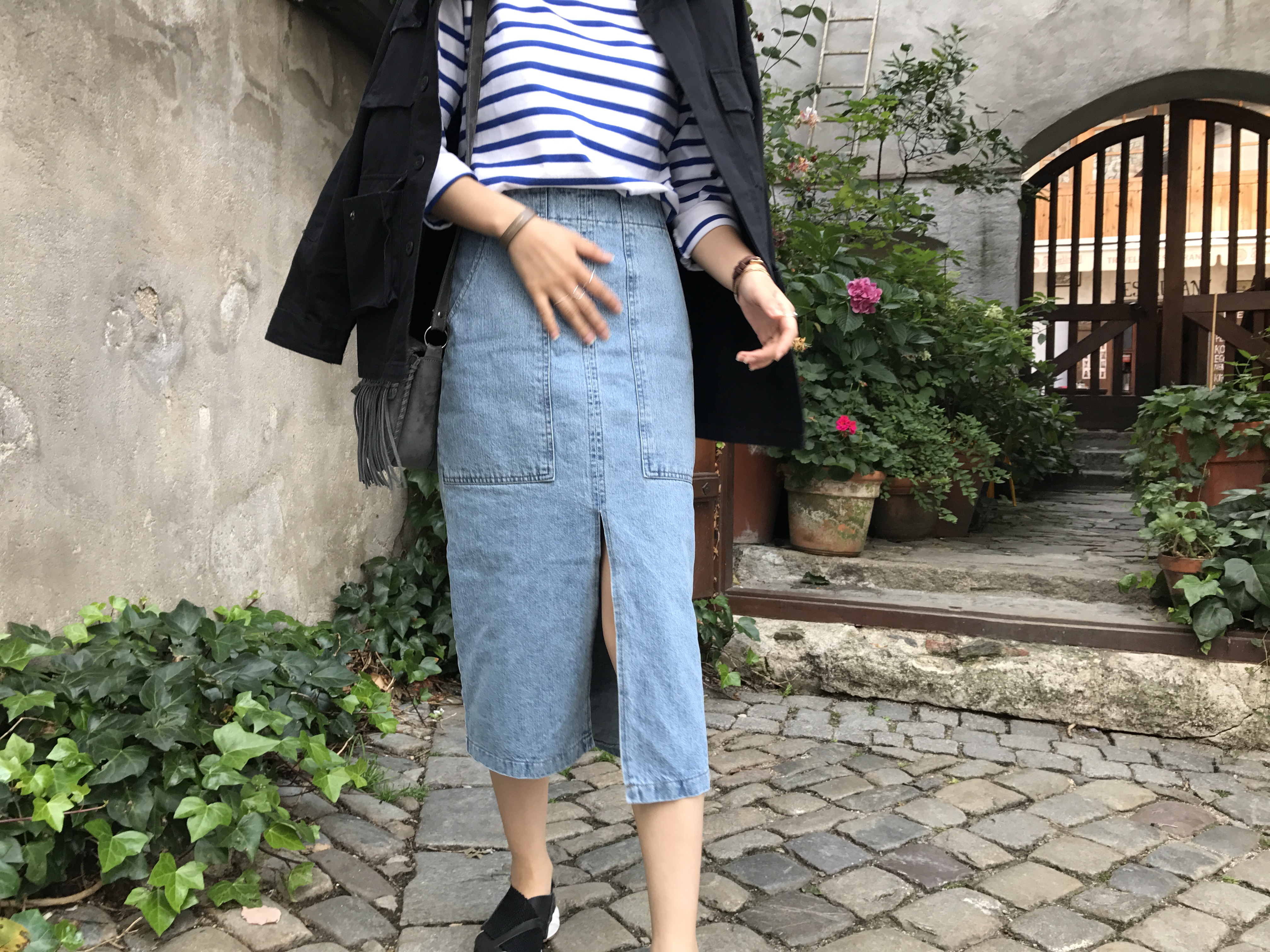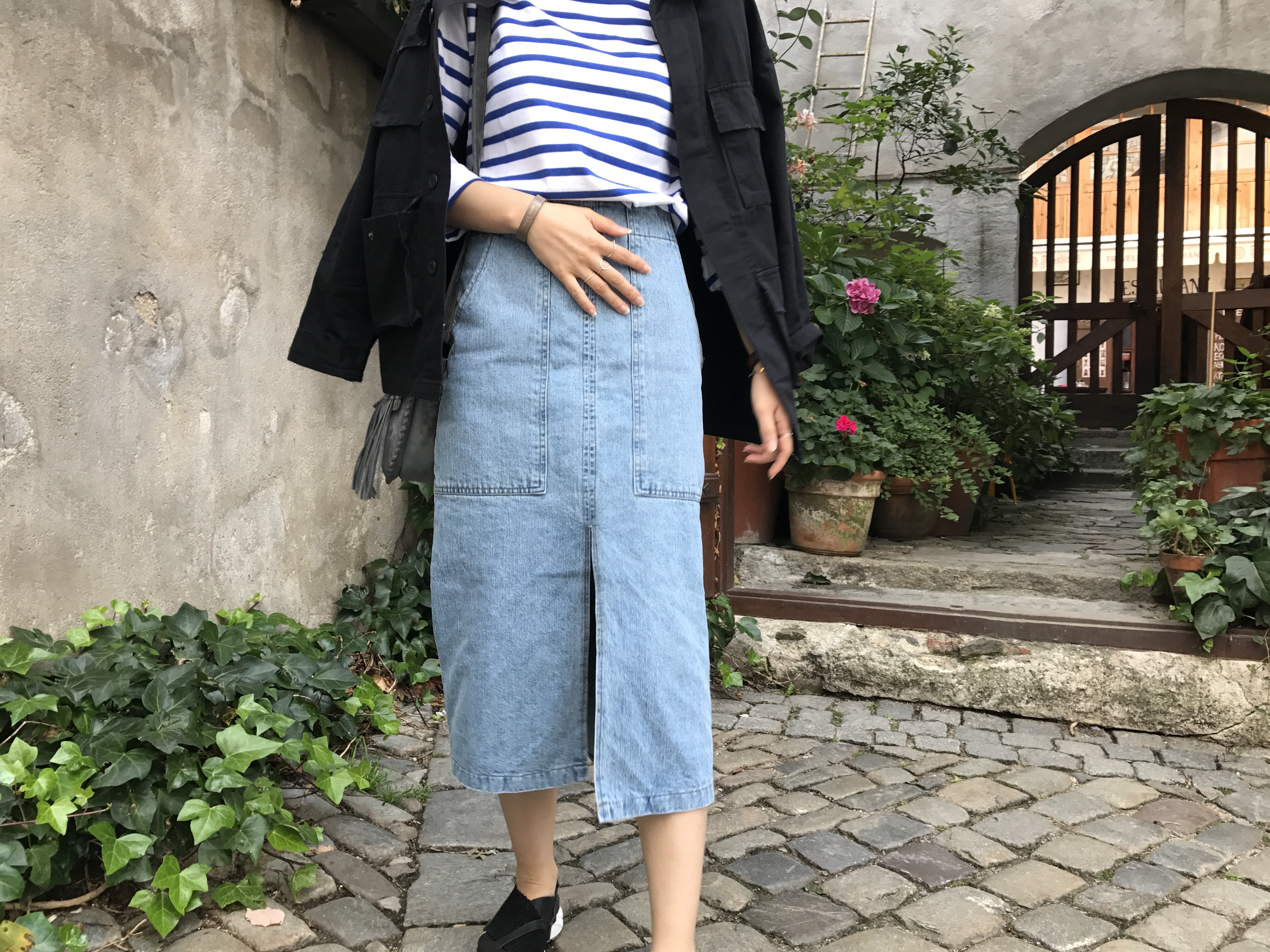 Long sleeved denim skirts and curly bands denim A line autumn