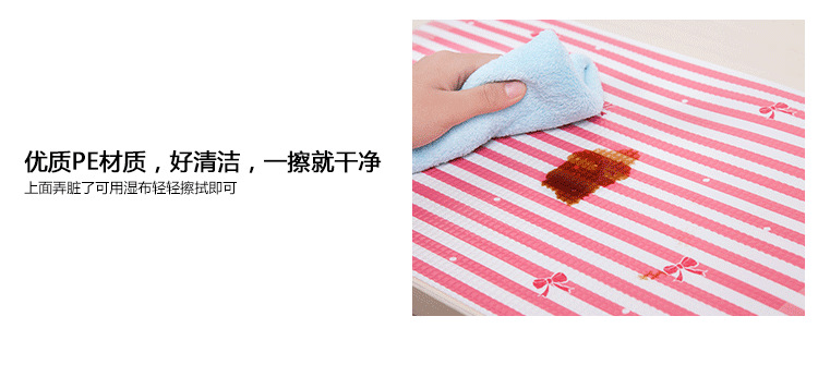 概要:  表层PE材质防潮防水防污,底层珍珠棉材质,有效防滑 对器具起到缓冲作用,适用于各类衣柜、橱柜、碗柜、灶台桌面等