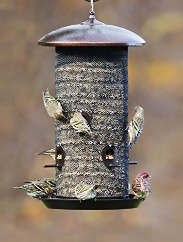 -. Feature : Multiple feeding positions / Two large capacity seed compartents / Holds over 8-pound of seed / Seed diverter helps keep seed fresh and moves seed into feeding area / Beautiful hammered copper finish is durable and will look great in your backyard