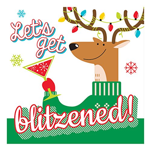 - Design features festive reindeer with lights decorating his antlers; reindeer holds a tasty holiday cocktail, napkin reads: Let's Get Blitzed