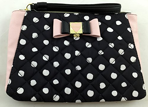 -. Feature : Zipper Across Top w/an Emblem Pull / Measures 9"x6", Attachable Wristlet / Pink and Black Bow on Outside w/ White Polka Dots