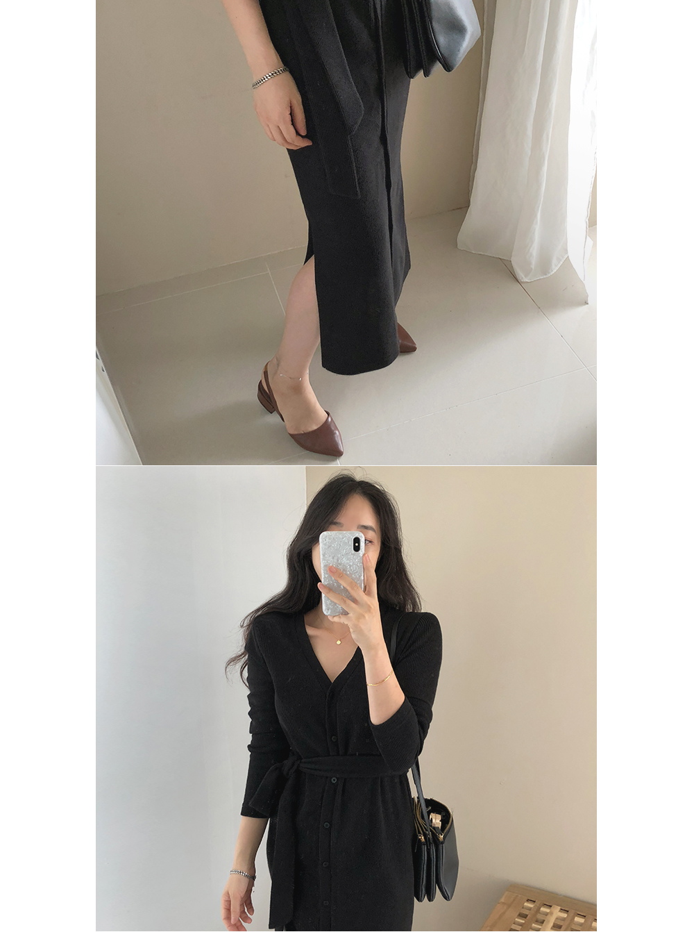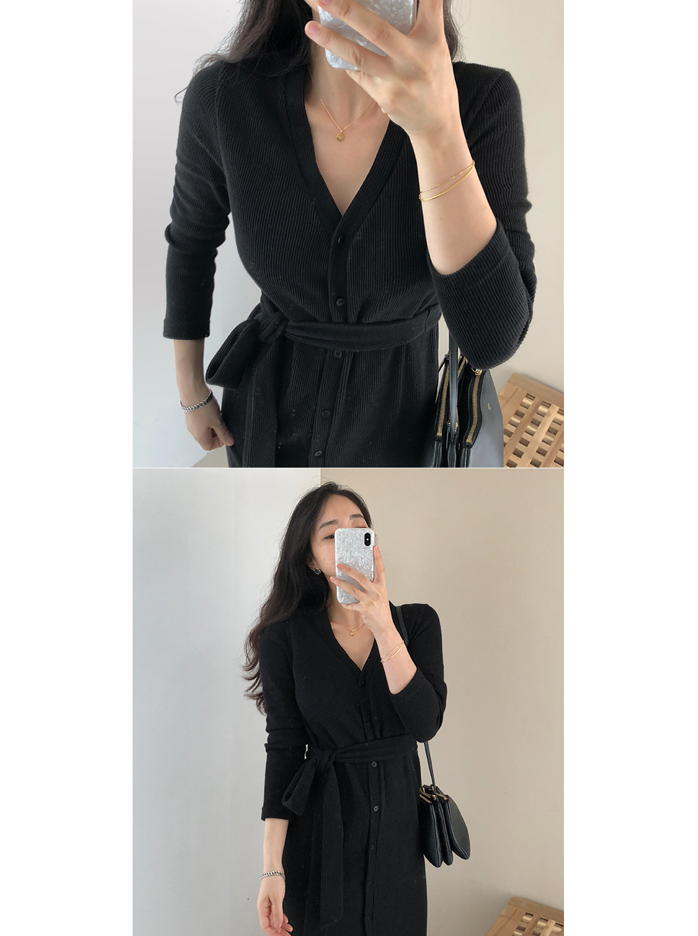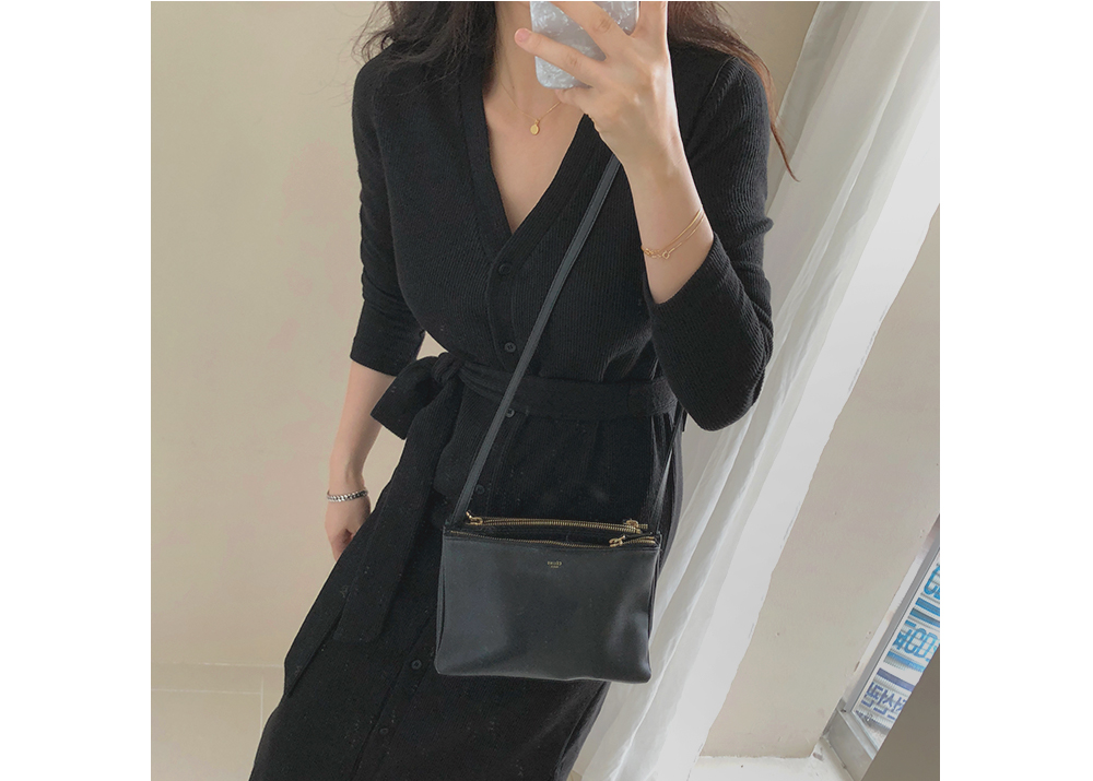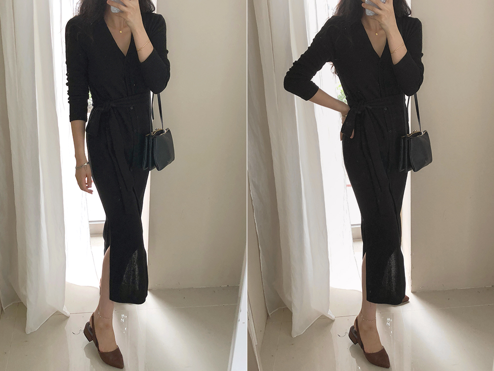 니트 스트랩 가디건 단추 롱 원피스