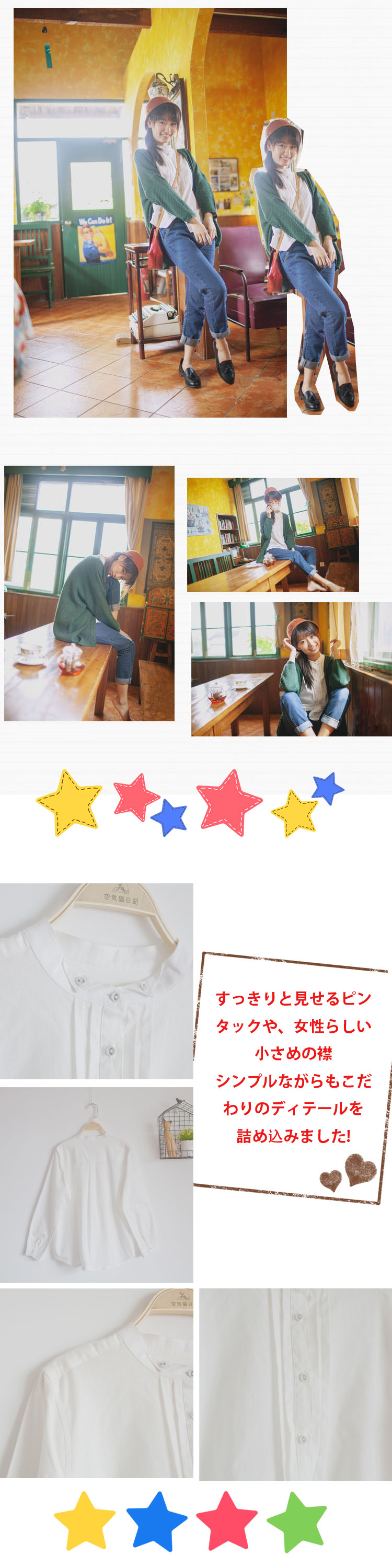 | ふんわりナチュラルな風合いのシャツが誕生。かわいい清楚なホワイトのブラウス。清楚できちんと感ある仕上がりに。変わり襟ピンタックブラウス女性らしい表情が増す小さめ丸襟デザインにクラシカルな雰囲気を加えたピンタックがスパイスに。シーンを問わずお使いいただけるので是非1枚は御用意頂きたいブラウス。 ベーシックカラーのスーツやアンサンブルと相性抜群です? 1枚ではもちろん、肌寒い季節の羽織としてや、ニットやジャケットなどと合わせたりと着まわしにも活躍間違いなし。毎日の着こなしに使える1着をぜひ、お試しくださいませ。 | |