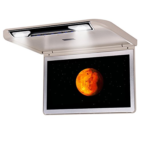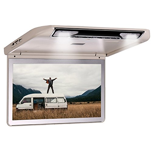 DDAUTO DD1336MW Car Roof Mounted 1080P HD Overhead Player Ultra Thin 13.3 Inch IPS Screen Flip Down Multimedia Player with Built-in USB SD HDMI Double Dome LED Lights for vans, trucks, SUVs, Beige