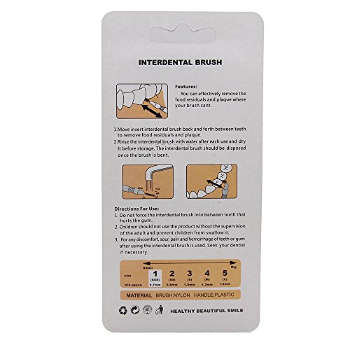 Specification: Type: Dental Cleansing Interdental Brush Material: ABS DuPont silk bristles Brush head size: 0.7mm (SSS) Feature: 1. Du Bang silk bristles, good elasticity,do not hurt the gums. 2. Elastic steel wire, easy to break, highflexibility, wear 3. With a separate cap design, clean, easyto carry. 4. Flat handle, conducive to hand-heldoperation, non-slip. 5.Can quickly and effectively remove theresidual material between the teeth and dental plaque, clean the mouth. How to Brush: 1. Put the suitable size interdental brushfor your crevice between teeth , and gently put it between teeth. 2. Moving back and front 2-3 times, removeteeth removed residue. 3. Clean the interdental brush after eachusing, we suggest to change it every week. 4.After cleaning, clean the gaps brush anddry it. Wear your own brush cover to protect the bristles. Note: 1. Do not force it for using to avoid harmof gum. when children use it, parents should accompany them. 2. It can not be?? swallowed. You should choose 0.7mm for firsttime using 3. Please choose the size according to yourdentist's advice. Package : 10 pcs Interdental Brush 0 |
