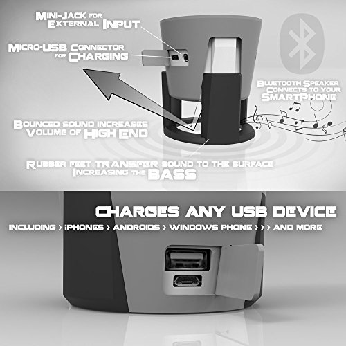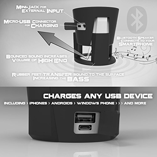 -. Feature : 20oz BPA-FREE water bottle / Premium 5W Bluetooth Speaker / The microphone turns your HYDRA into a hands-free speakerphone! / BRIGHT, FLASHING RED LED EMERGENCY light, WHITE lantern, RGB Color Cycle! / 4000 mAh ultra-safe polymer Power bank (with 2.1a USB output)