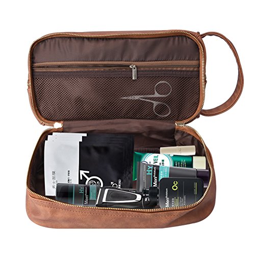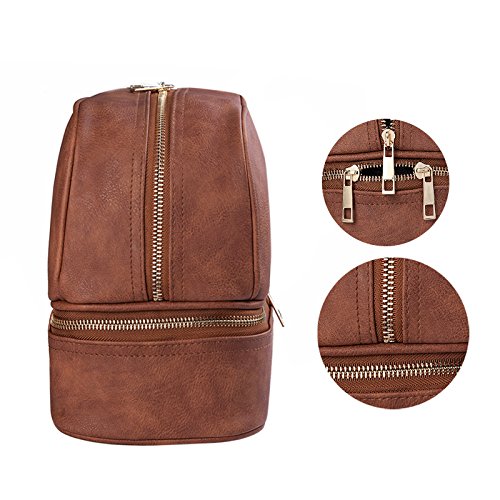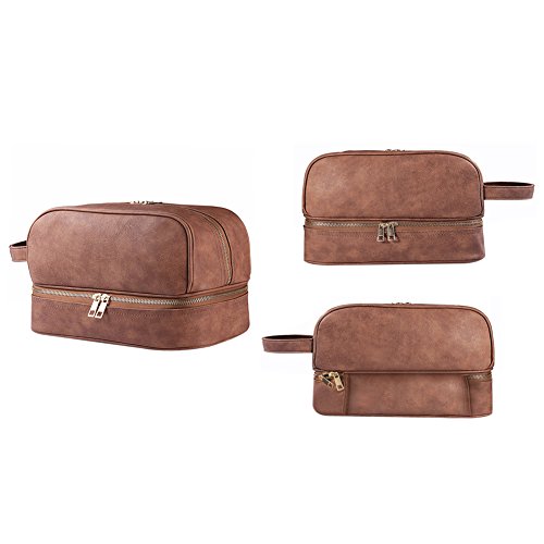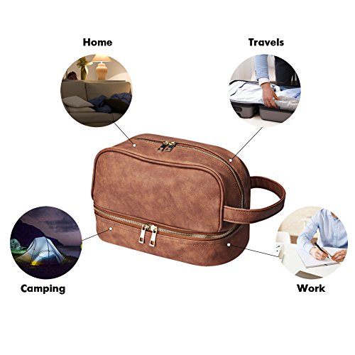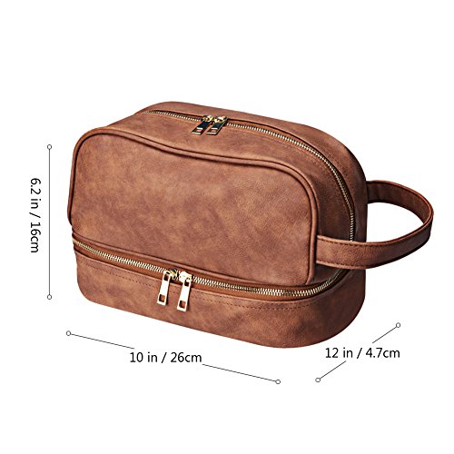 Goldwheat Travel Toiletry Hanging Bag Men PU Leather Cosmetic Makeup Bag Double Layer Toiletry Shaving Kit Organizer in Brown