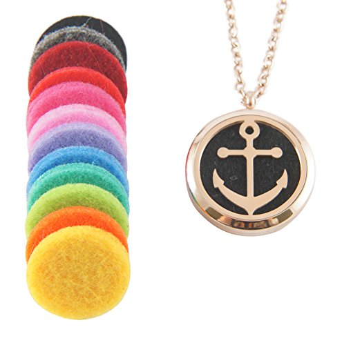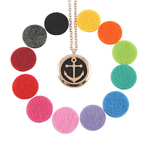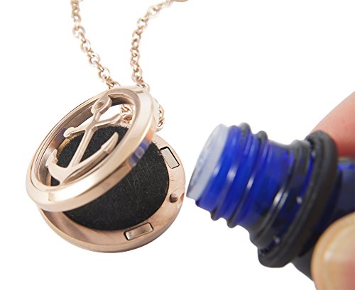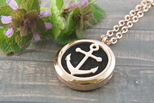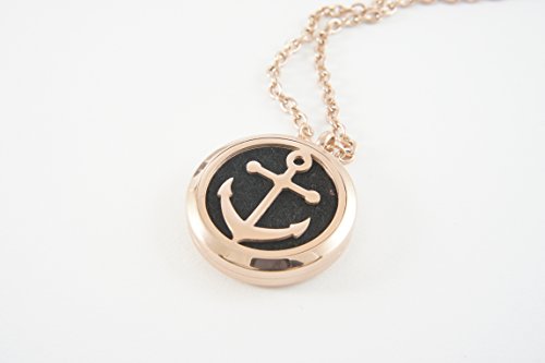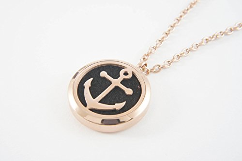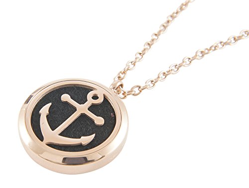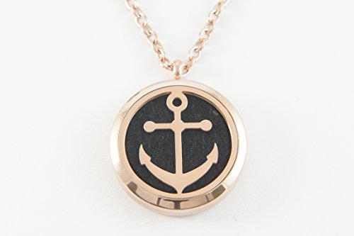 Rose gold plated 316 stainless steel anchor locket essential oil diffuser necklace. High quality, hypoallergenic. Aromatherapy jewelry pendant. Comes with 12 different colors of felts pads. Great gift for women, mothers, Mother's Day, Valentine's Day, Birthday and Holidays. LAVENDER oil is a calming and relaxing basic #1 oil, CHAMOMILE oil is great for the treatment of nervous conditions and insomnia, GERANIUM oil helps hormone balance and menopause, ROSEMARY oil helps relaxing muscles, EUCALYPUS oil works for coughs, colds and rheumatic conditions and boost the immune system. These are just a few examples. There are so many ways to enjoy essential oils! It is great that you can bring your fragrance anywhere you go with your oil diffuser necklace. Treat yourself! Chain length is 60 cm (23.5 inches) + 5 cm (2 inches) extension. Locket is 30mm.Feature