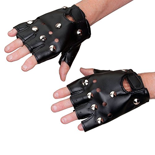 -. Brand : Jacobson Hat Company -. Color : Black -. Department : unisex-adult -. Feature : These faux-leather black fingerless gloves with silver studs make a great accessory for bikers, tough guys, and 80s costumes. / One size fits most adults - adjust with the velcro strap at the wrist. / Intended for ages 14 and up. -. ProductGroup : Apparel -. ProductTypeName : ADULT_COSTUME -. Size : One Size fits Most -. Title : Biker Gloves with Studs - Black -. UPC : 763285223747