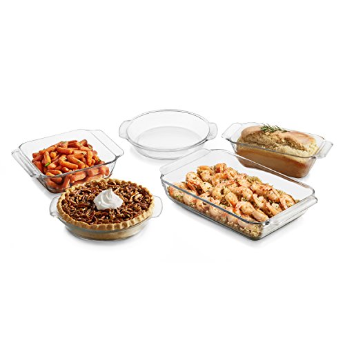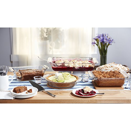 - Includes 1, 9-inch by 13-inch glass bake dish; 1, 8-inch by 8-inch glass bake dish; 1, 9-inch by 5-inch glass loaf dish; and 2, 9-inch glass pie plates