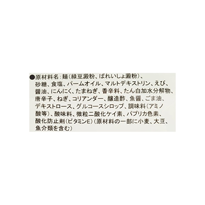 원재료:면(녹두 봄비,들켜 있어 # 전분)고, 설탕,식염,팜 오일,말 덱스트린,새우,간장,마늘,타마 파,향신료,단백 가수분해물,고추,파,코리안 다《―》,양조초,어장,참기름,잘 나가 스트로《스》,글루코스 시럽,조미료(아미노산등)고, 신맛료,미립2산화 규소,파프리카 색소,산화 방지제(비타민E)고,(원재료의 일부에 밀,대두,어패류를 포함한다)