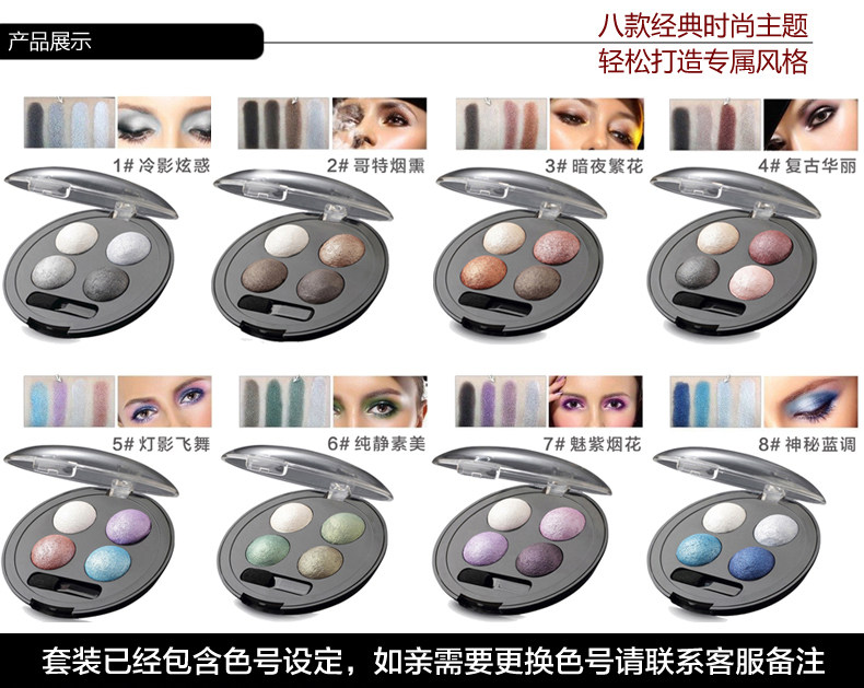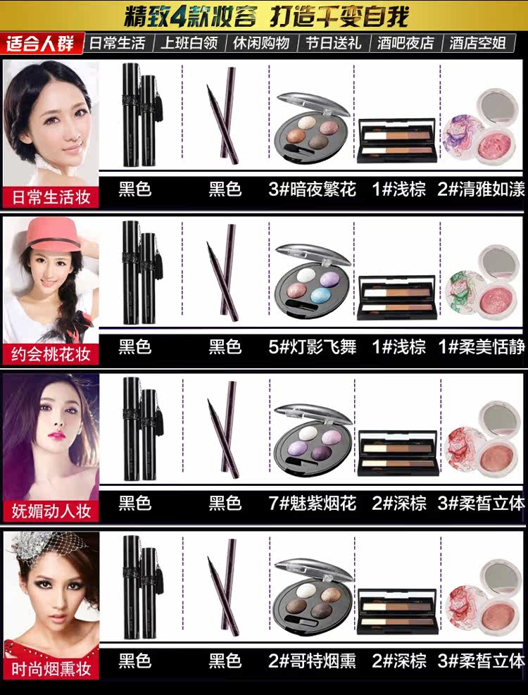 眼线笔+睫毛膏+眉笔+眼影=酷黑速干眼线笔+黑流苏蜜语睫毛膏+自然生动眉笔(1-5号色请联系客服留下色号)+无限魅惑眼影(3#暗夜繁花)