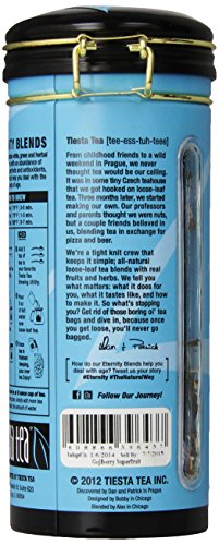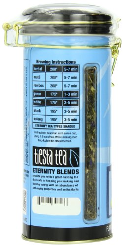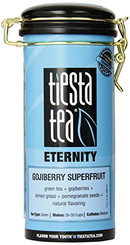 -. Binding : Grocery -. Brand : Tiesta Tea -. EAN : 0608866396437 -. Feature : Tiesta tea's eternity product line features all-natural loose-leaf tea blends packed full of anti-oxidants that slow down aging / One tin canister filled with 4 ounce of a green tea blend that makes about 15 to 30 cups of tea / Ingredients include green tea, gojiberries, lemongrass, pomegranate seeds / For the best flavor, steep at 175 degrees Fahrenheit for 1 to 3 minutes / Includes an elegant clasp to quickly and easily open and close the canister -. Label : Tiesta Tea -. Manufacturer : Tiesta Tea -. MPN : BG19045 -. NumberOfItems : 1 -. PackageQuantity : 1 -. PartNumber : BG19045 -. ProductGroup : Grocery -. ProductTypeName : GROCERY -. Publisher : Tiesta Tea -. ReleaseDate : 2013-07-29 -. Size : 4 Ounces -. Studio : Tiesta Tea -. Title : Tiesta Tea Eternity Green Tea, Gojiberry Superfruit, 4.0 Ounce -. UPC : 608866396437