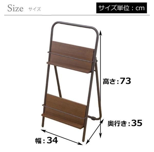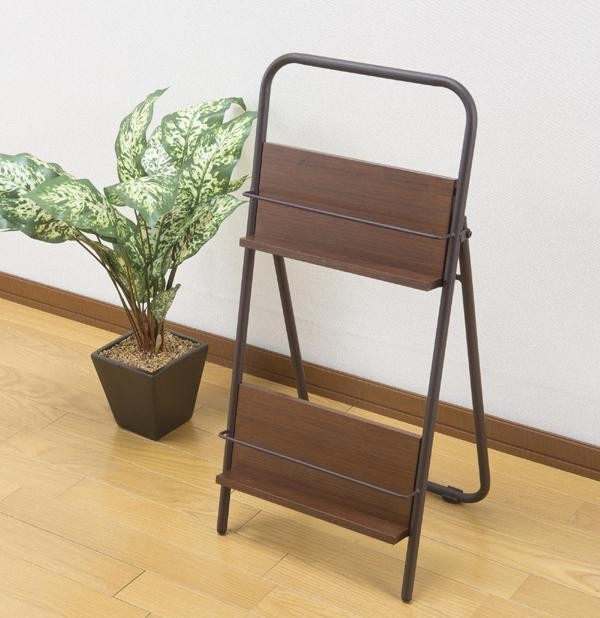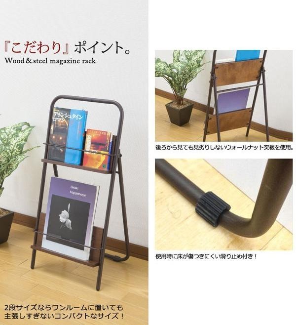 | CDや雑誌を立てた状態で収納できるマガジンラックです。アンティークブラウンのスチールフレームとウォールナット突板の組み合わせがお洒落♪折りたたみ可能なので、持ち運びも楽々です。 |