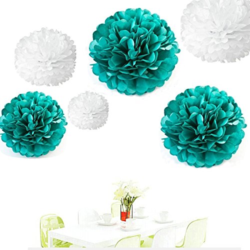 Since ® 12PCS Mixed Sizes White & Teal Blue Tissue Paper Flower Balls Pom Poms Pompoms Wedding Party Decoration Holiday Supplies
