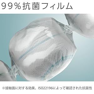 기저귀를 감싸 해석 자체 개발 한 항균 필름은 항균력 99 %! 필름 표면의 세균 번식을 억제합니다. ※ 접촉면에 대한 효과, ISO22196에 의해 확인 된 항균 |