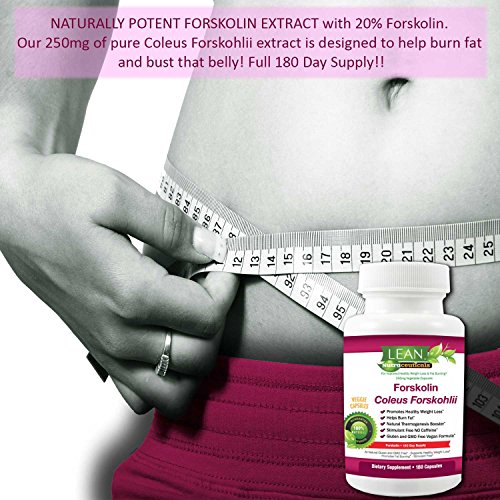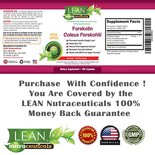 -. Binding : Health and Beauty -. Brand : LEAN Nutraceuticals -. EAN : 0646437812320 -. Feature : 250 MG NATURALLY POTENT FORSKOLIN with 20% Forskolin extract. Our pure Coleus Forskohlii extract is designed to help burn fat and bust that belly! Full 180 Day Supply!! / PACKED WITH GMO FREE 100% Natural Coleus Forskohlii Root Extract. Optimized to give you the maximum recommended dosage of 250mg per serving economically and with flexibility. Our laboratory designed formula is a concentrated yet tummy friendly 20% to avoid the bloating and stomach upset associated with unwisely aggressive extracts. / GLUTEN FREE & STIMULANT FREE formula helps promote the breakdown of stored fat in cells. It may also release aid in the release of fatty acids from adipose tissue, which results in increased thermogenesis, resulting in loss of body fat and increased lean body mass. / **BUY RISK FREE** - If you are not 100% Satisfied with your results, for any reason or no reason at all WE'LL GIVE YOU A REFUND!! LEAN Nutraceuticals is your premium nutraceutical company focused on health, wellness and customer satisfaction. Look at our Seller Rating and Buy WITH CONFIDENCE! / LEAN NUTRACEUTICALS research verified forskolin capsules are safely manufactured in the USA in FDA inspected and GMP certified manufacturing facilities using a bio-engineered extraction process that ensures purity, potency and efficacy. -. IsAdultProduct : 0 -. Label : Lean Nutraceuticals -. LegalDisclaimer : No statements made about this supplement have been evaluated by the Food and Drug Administration. This product is not intended to diagnose, treat, cure or prevent any disease. Pregnant or nursing mothers, children under the age of 18, and individuals with a known medical condition should consult a physician before using this or any dietary supplement. -. Manufacturer : Lean Nutraceuticals -. MPN : Forskolin 180 -. PackageQuantity : 1 -. PartNumber : Forskolin 180 -. ProductGroup : Health and Beauty -. ProductTypeName : HEALTH_PERSONAL_CARE -. Publisher : Lean Nutraceuticals -. Studio : Lean Nutraceuticals -. Title : 180 Ct! Forskolin Extract for Weight Loss Pure 20% 250mg - Natural Coleus Forskohlii Veggie Capsules Belly Buster for Fat Loss Premium USA FDA GMP Forskolin Supplement Capsules - LEAN Nutraceuticals -. UPC : 646437812320