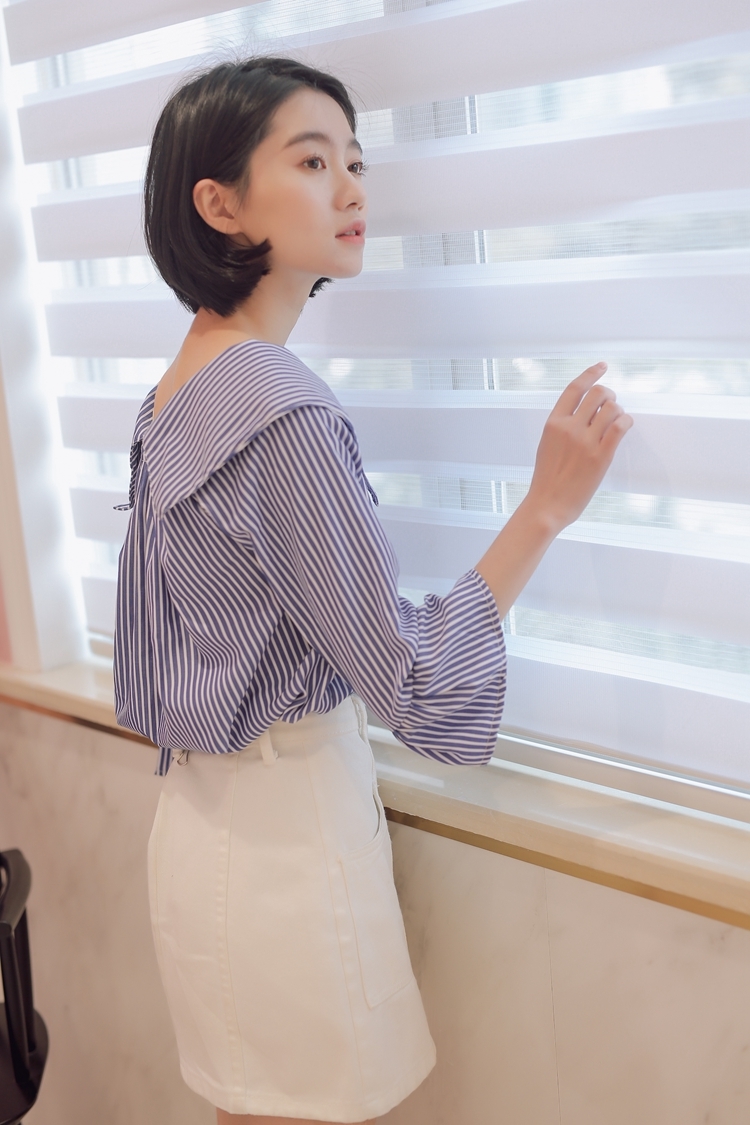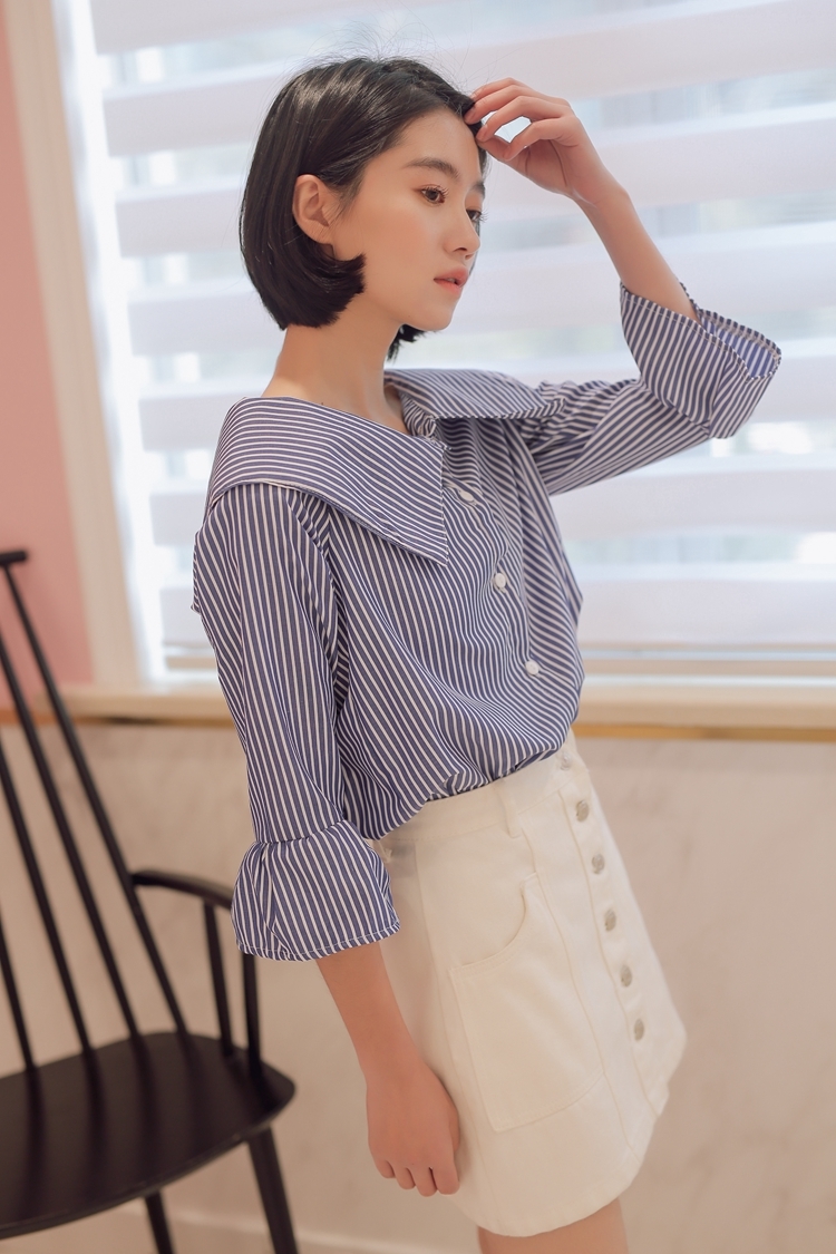 爽やかなカラーで女性らしく清楚な雰囲気の七分袖ストライプシャツです。