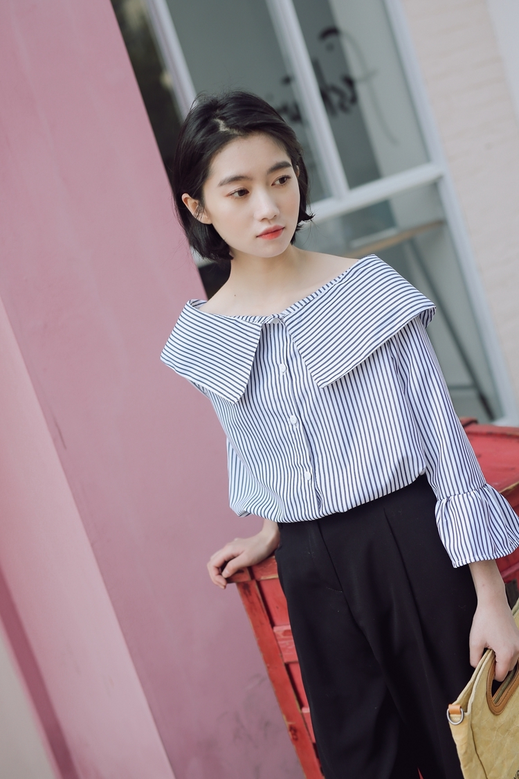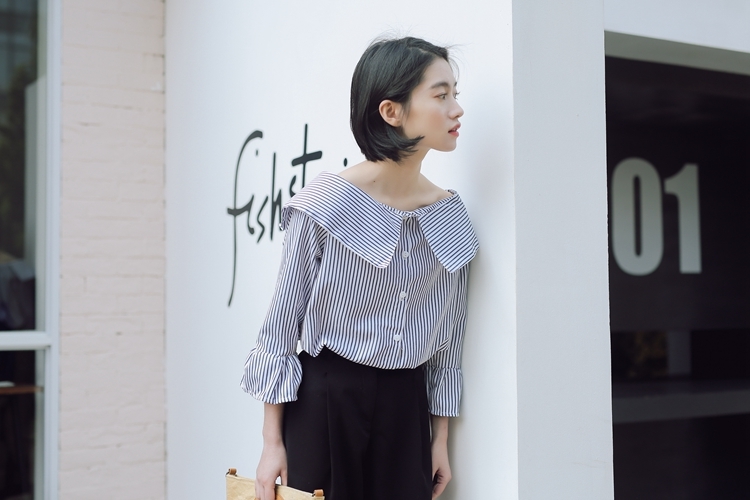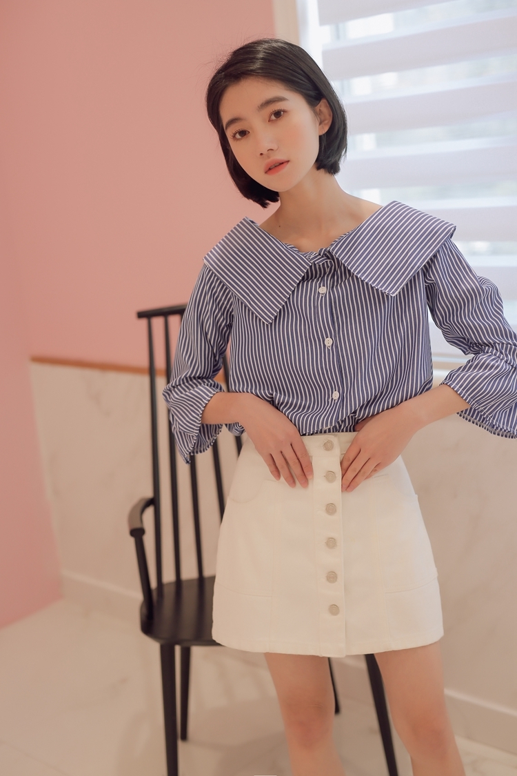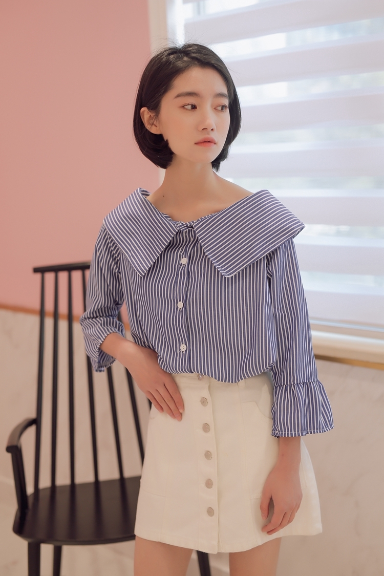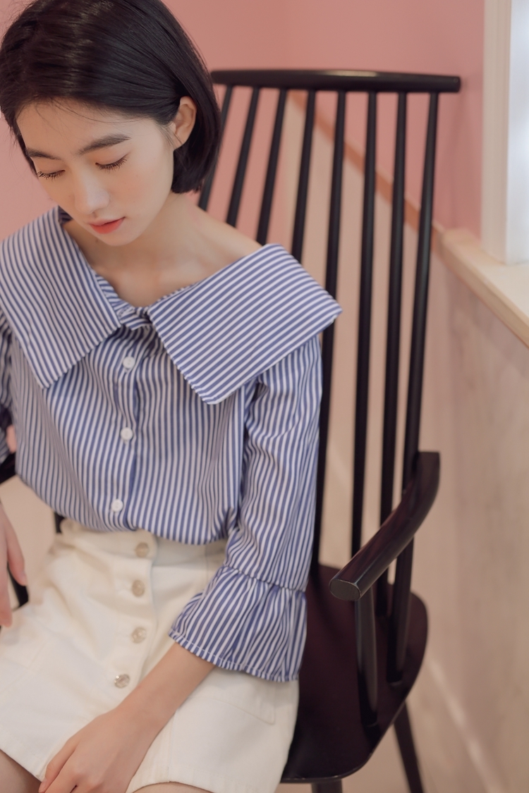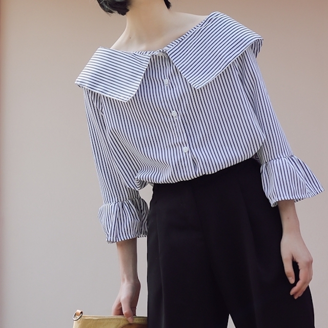 大きな襟が印象的で、しっかりと開いた首回りが鎖骨を綺麗に見せてくれます。