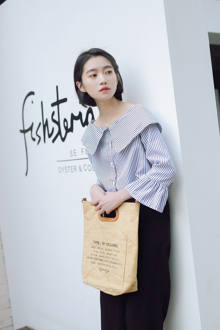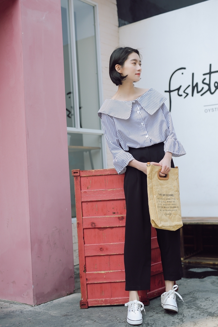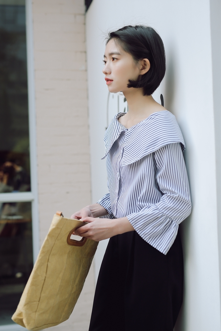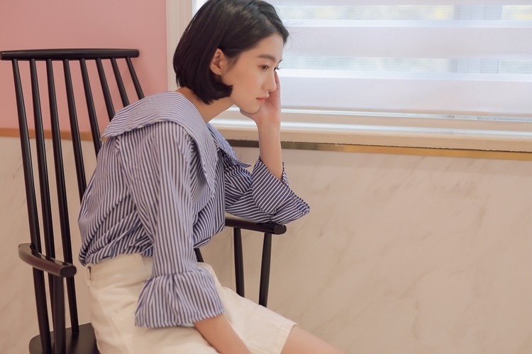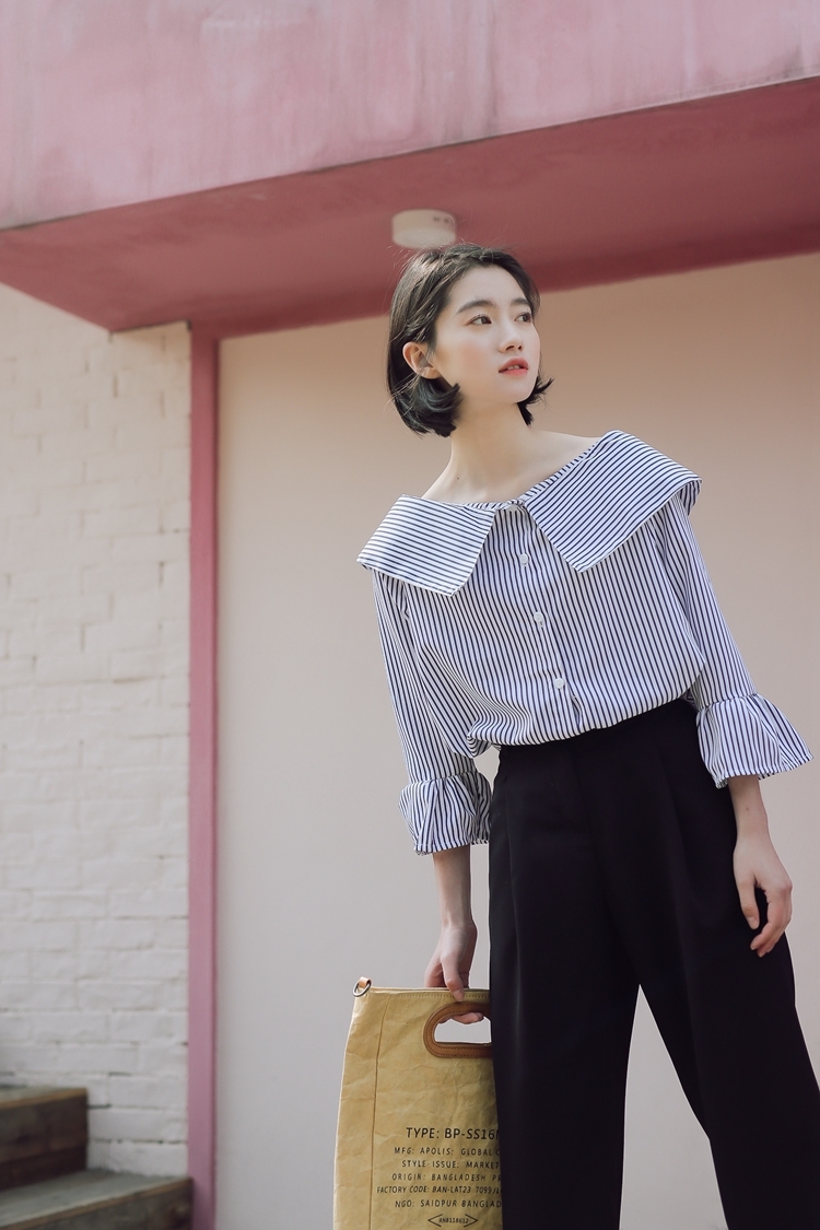 大きな襟が印象的で、しっかりと開いた首回りが鎖骨を綺麗に見せてくれます。