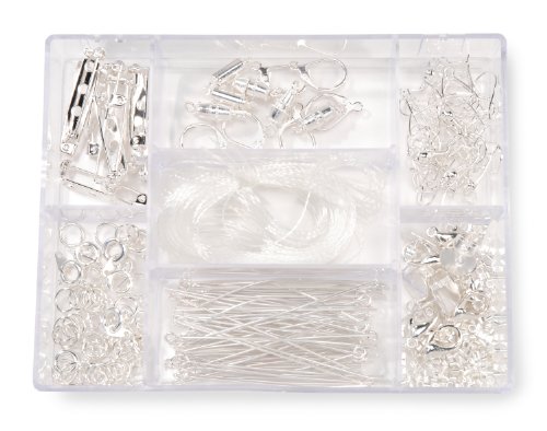 Darice's Bright Silver Finding Starter Kit includes: 20 Yard spool of thread, 2 barrel clasps, 4 lobster clasps, 6 fish hook earrings, small kidney wire earrings, 4 lever back earrings, 2 magnet clasps, 30 7 mm jump rings, 6 10 mm post earrings, 8 7 mm spring rings, 10 pin backs, 30 2 inch head pins, 30 2 inch eye pins and 2 grams of 2.5 millimeter crimp beads.Feature