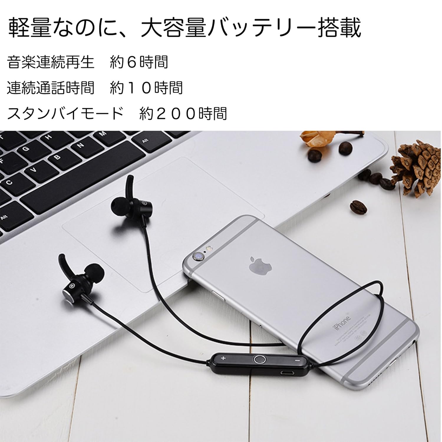 【大容量バッテリー】1回約2時間の充電で約6時間の音楽再生。通話時間に至ったは約10時間の連続通話が可能。便利な電池残量もお持ちのスマホに表示されます。