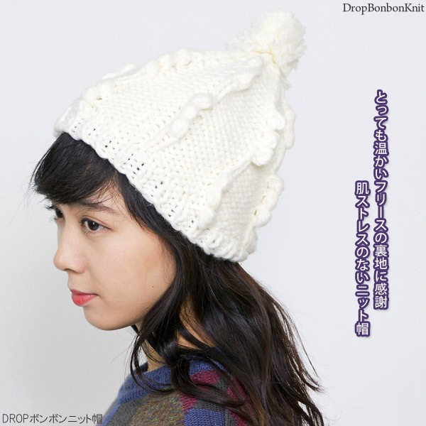 とってもキュートな冬の定番ざっくりボンボンニット帽★ストライプ織り部分に、まぁるいボンボンを配置したとっても可愛らしいデザインです。しかも、内側のおでこ部分にはフリースの内布が張られていて、ちくちくする肌ストレスもなく、保温力は最強に!!最初、少しピッタリしますが、被っていくうちに程よい加減になじんできます。
