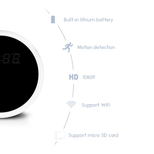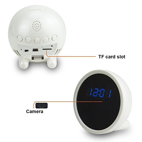 -. Feature : Hidden Camera: it is hidden spy camera like a indoor alarm clock,You can record both photos and video without anyone pay attention.the best tool for home security or monitoring and collection of evidence / New Technology: It support to use iOS iPhone, iPad, android mobile phone, tablet PC, laptop PC devices to real time view video record / Strong Function:It's Full HD1080 mini DV camera,Built-in microphone,Support real-time video recording,snapshot,audio recording / Max Supports: Support 4 users online in the same time.and Support up to 32GB TF card (Not Included) / Alarm Clock Function: Time&date display, Alarm&snooze, HourPower function