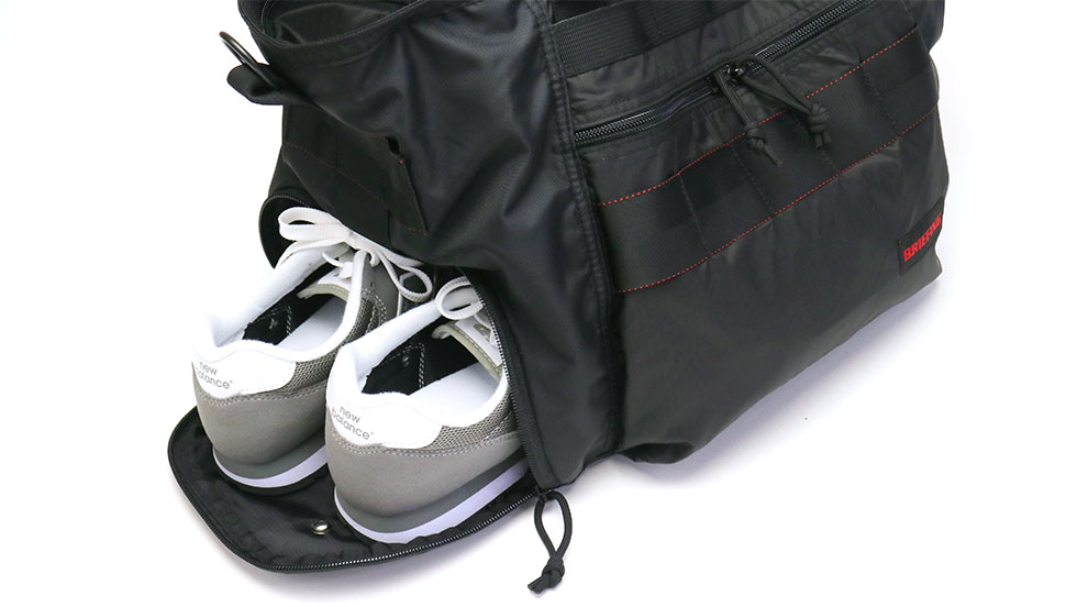 外側サイドには出先や旅先でシューズを履き替える際に便利なシューズポケットを装備しています。シューズはもちろん、濡れたアイテムや汚れたアイテムなどの収納にも最適です。