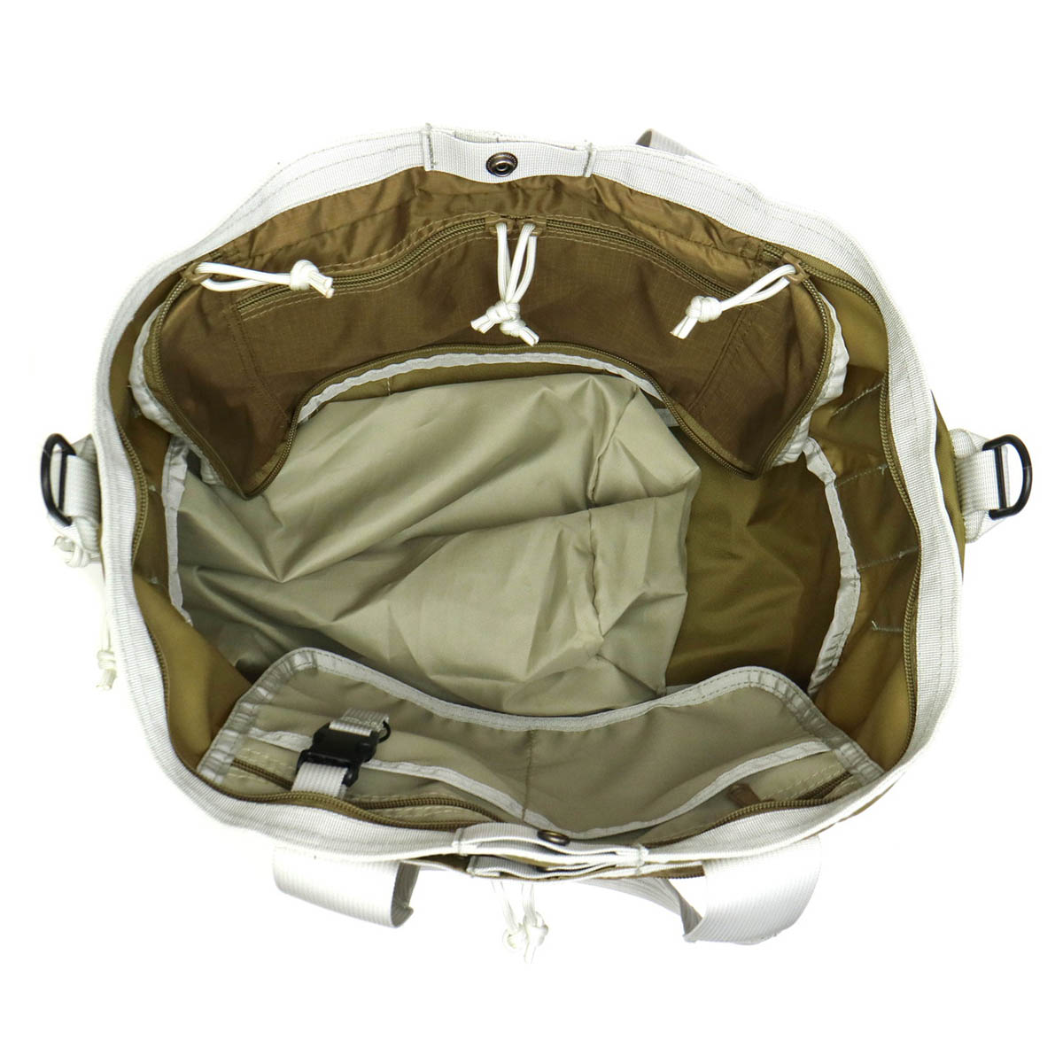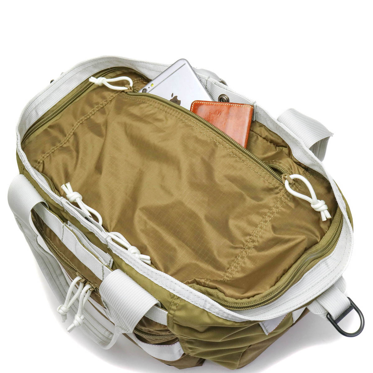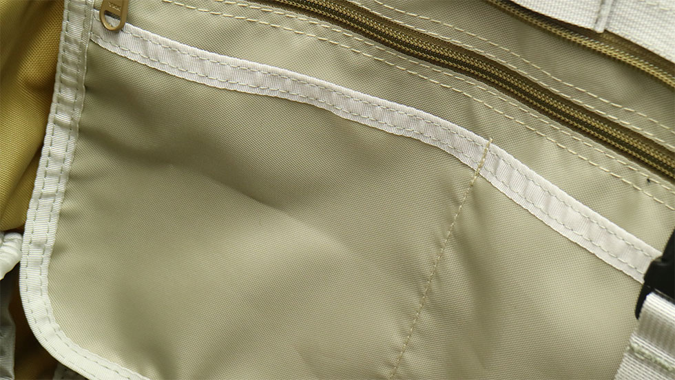 収納口はジップとスナップが取り付けられ、荷物の量に合わせて使い分けが可能です。フラップ部分には外出時に便利なジップポケットを設けています。