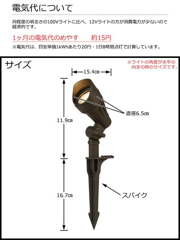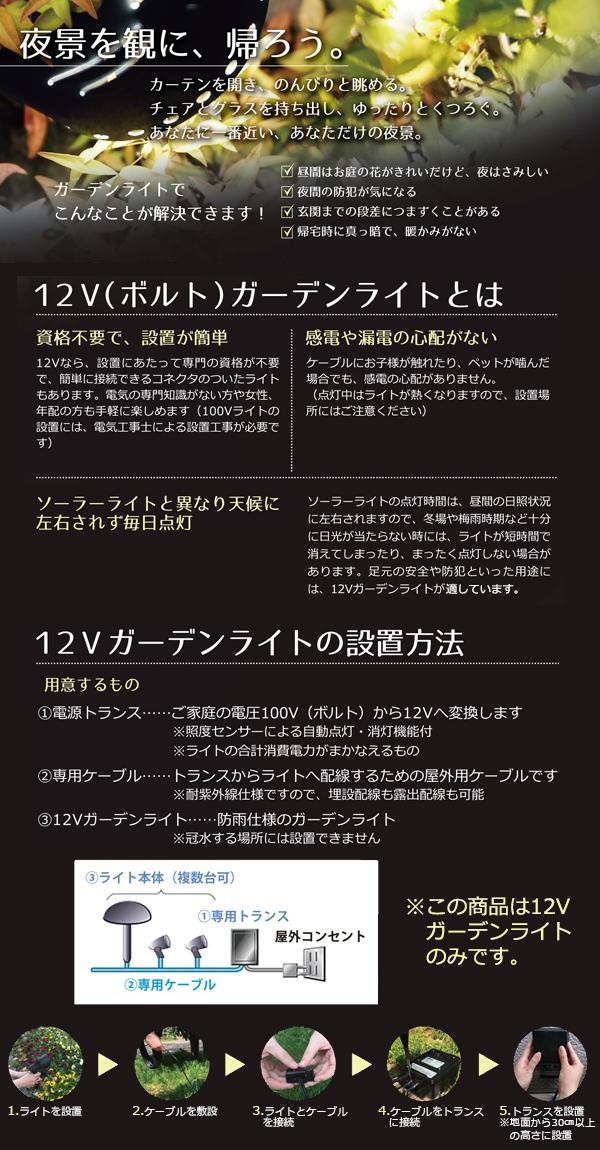 | 仕様 | 3.2WLED 色温度:3000K(電球色) 全光束:240ルーメン 電圧:12V 定格寿命:約40000時間 配光角度:35度 照射距離めやす:3m(周囲の明るさによって変わる) 黒色 防雨型 LED交換不可 専用トランス及びケーブルが別途必要 メーカー指定以外の電源トランスは使用不可 |