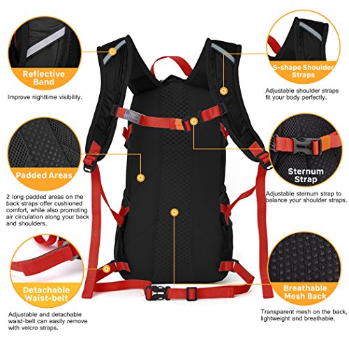 -. Feature : MATERIAL- Polyester ,Water-resistant Polyester as the fabric do not allow water to easily penetrate. / CAPACITY- 15L (915 cube inches).Hydration bcakpack for cycling, hiking, running, biking, climbing etc. Breathable and Lightweight hydration pack perfect for your bicycle or day-hike adventures. / BEARING SYSTEM- 2 long Padded Areas on the back straps offer cushioned comfort, while also promoting air circulation along your back and shoulders. S-shape adjustable shoulder straps fit your body perfectly. / HYDRATION SYSTEM COMPATIBLE- Internal hydration bladder's compartment and on the top for the water tube outlet . Big engugh for 2 liters hydration bladder. (Hydration bladder not included). / DETACHABLE WAIST-BELT- Adjustable and detachable waist-belt can easily remove with velcro straps