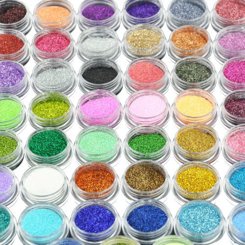 -. Feature : 45 x Nail Art Glitter Decoration / Blue, Deep Blue, Purple, Light Purple, Pink , Red, Yellow, Silver, Black, Light Green, Green , White and etc / Suitable for nail art decoration with nail polish, UV builder gel, UV Top Coat, etc. / Diameter of each jar : 2.5cm / Net Weight : ~3g each