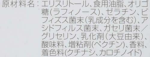 erythritol edible oils and fats oligosaccharides (raffinose) (including the milk component) gelatin bifidobacteria end acidophilus bacterial powder gasseri bacterial powder / glycerin emulsifier (from soy) acidulant thickener (pectin) flavoring coloring (gardenia carotenoids)
