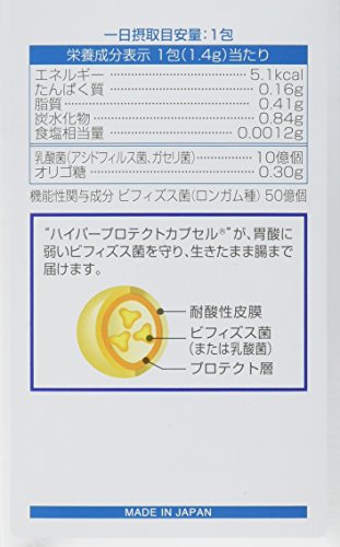 bifidobacteria (longum species) per 1 package to improve the flora in the gut it has been reported that there is a function to improve the bowel movement.