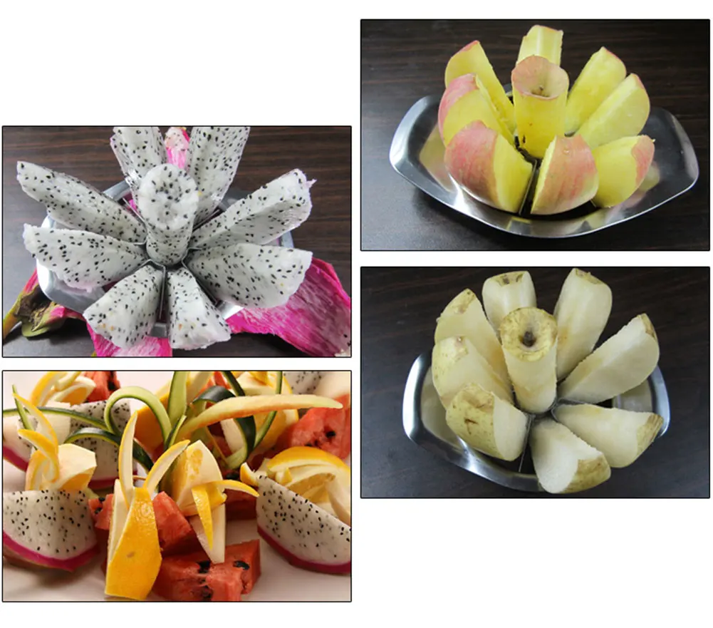 Cuts apples, pears, and dragon fruits. Unleash your imagination and make your own fruit platter.