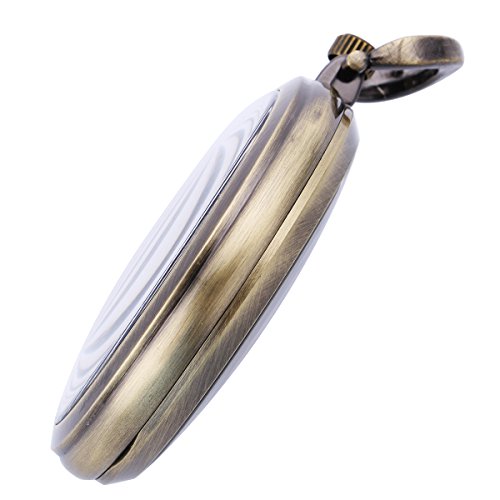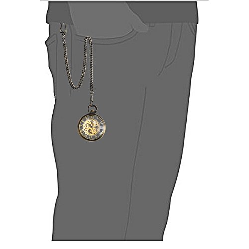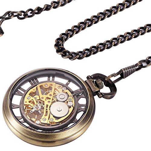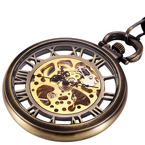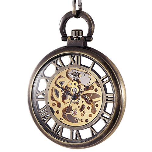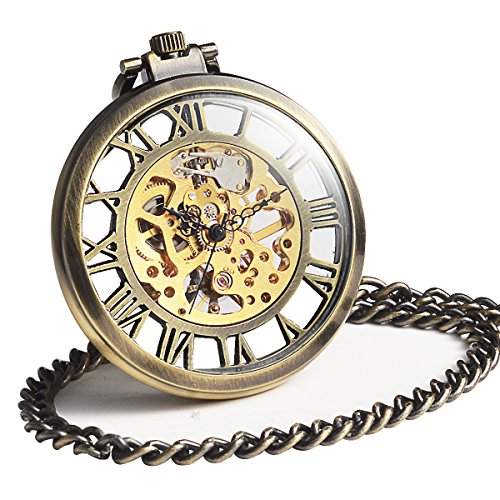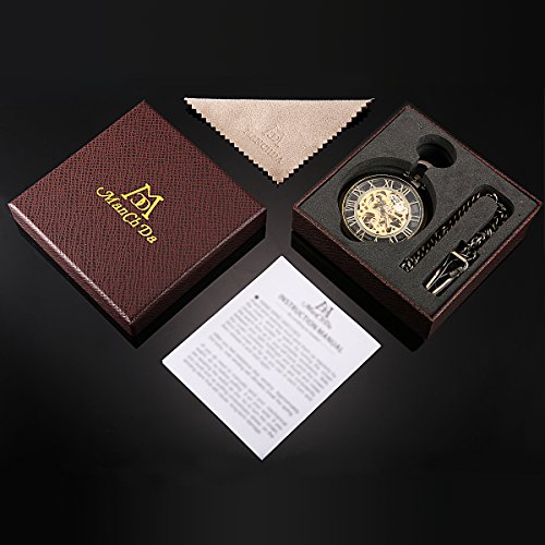 -. Title : ManChDa Mechanical Brass Big Wheel Golden Movement Skeleton Pocket Watch Fob Open Face with Chain + Gift Box