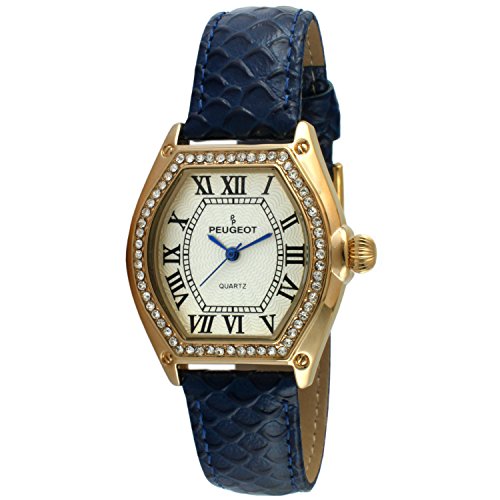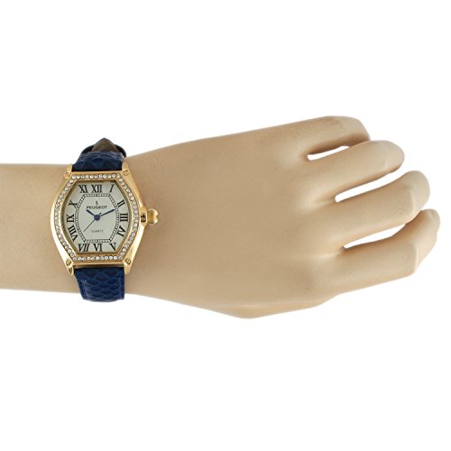 The Peugeot #679 Women's 5 strap interchangeable set, is the perfect gift for that lady who cannot make up her mind or just has too many outfits to accessorize with. Each genuine leather has a built in easy release spring bar that is simple to remove or put on with no tools at all. Simply slide down the small lever at the back of the strap and the strap will be released. Choose from one of the 5 colorful straps provided ,match it to your outfit ,slide it back in place and you are ready to look your best in no time at all. The classic barrel shape case has a jeweled bezel encrusted with brilliant hand set European crystals. The vintage roman numerals markers are applied on a wavy textured dial and are accented with metallic blue hands. To top it off, this wardrobe watch set is backed by Peugeot's exclusive Lifetime warranty which includes Free battery replacement as long as you own your watch. Packaged in Peugeot's signature red gift box, this wardrobe set makes an impressive gift at a great value!Feature