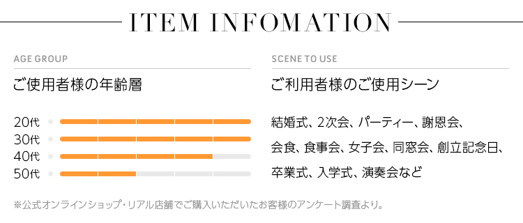 | 使用場面 | 結婚式、パーティー、二次会、謝恩会、食事会、デート 他 |