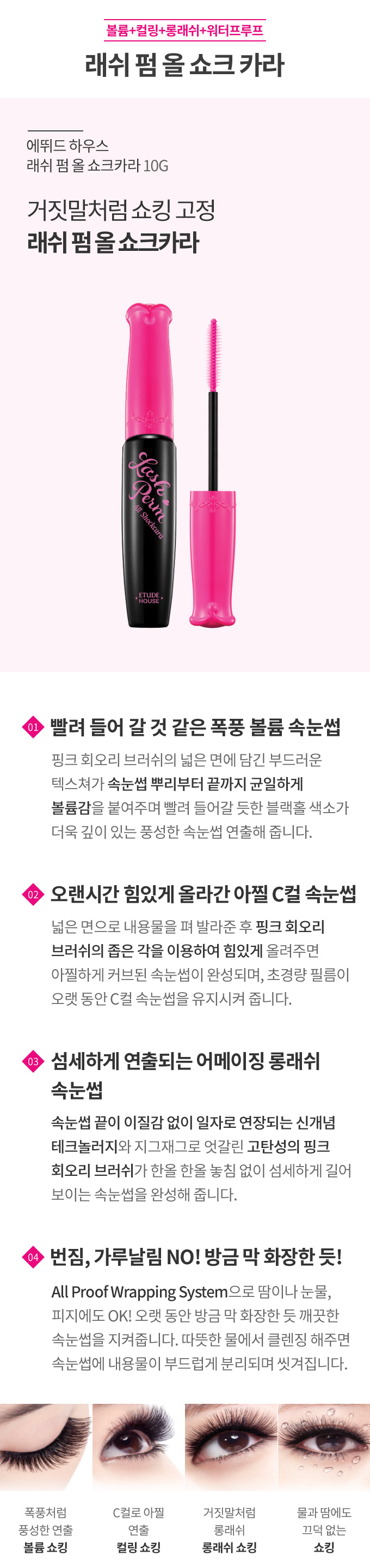 ボリューム・カーリング・ロングラッシュ・ウォータープルーフの4重機能性のマスカラです。