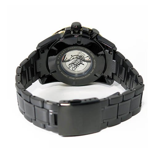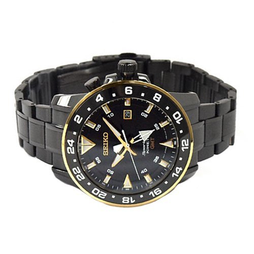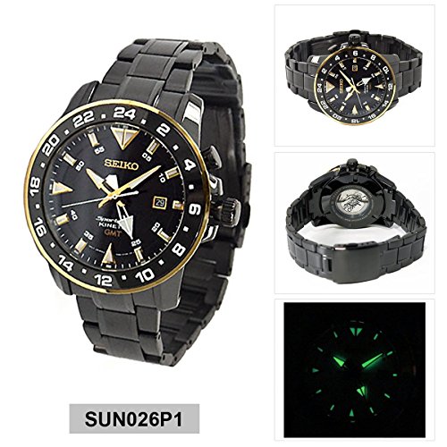 Black-plated stainless steel case and bracelet. Uni-directional rotating yellow gold-tone bezel with a black top ring showing 24 hour (GMT) markings. Black dial with luminous gold-tone hands and index hour markers. Minute markers around the outer rim. Dial Type: Analog. Luminescent hands and markers. Date display at the 3 o'clock position. Quartz movement. Scratch resistant Hardlex crystal. Screw down crown. Skeleton case back. Case diameter: 44 mm. Case thickness: 13 mm. Round case shape. Band width: 20 mm. Deployment clasp with push button release. Water resistant at 100 meters / 330 feet. Functions: GMT, date, hour, minute, second. Sport watch style. Watch label: Japan Movt. Seiko Sportura Kinetic GMT Black Dial Stainless Steel Mens Watch SUN026.Feature