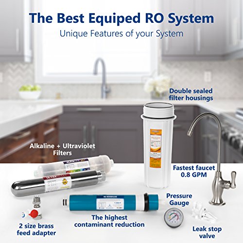 Included Components:Ultraviolet Sterilizer ◼ UV Bulb ◼ 4 gallon Water Storage Tank ◼ Tank Valve ◼ Deluxe Chrome RO Faucet ◼ Pressure Gauge ◼ All filters needed for setup (Sediment, Carbon Block, GAC, RO Membrane, Post Carbon, Alkaline) ◼ Filter Housings ◼ Leak Stop Valve ◼ Filter Housing Wrench ◼ Brass Feed Adapter Valve ◼ Quick Connect Faucet Adapter ◼ 22 feet of 1/4" color poly tubing ◼ Drain Saddle ◼ Teflon Tape ◼ Flow Restrictor ◼ Automatic Shut-Off Valve