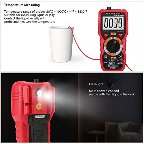 - General purpose digital multimeter tests AC/DC voltage, AC/DC amperage, resistance, capacitance, frequency, diode test, temperature, and continuity with built-in NCV, live wire tester and flashlight