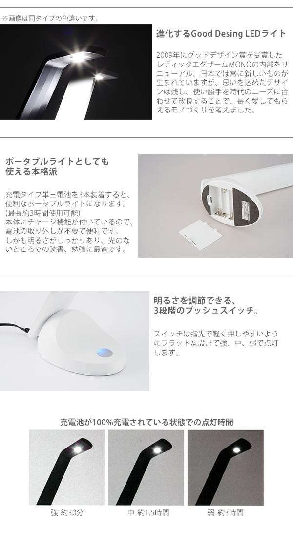 シンプルでフラットなデザインが使いやすいLEDライトです。電源コードでの使用だけでなく充電タイプ単3電池を3本装着すると、便利なポータブルライトになり、光のないところでの読書、勉強に最適です。スイッチは指先で軽く押しやすいようにフラットな設計で、強・中・弱と明るさを調節できます。 |