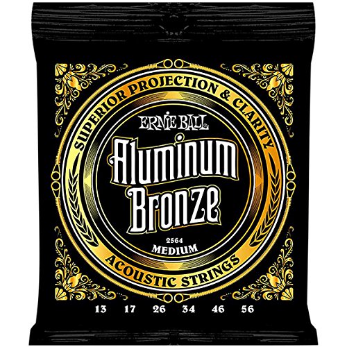 Studio : Ernie Ball Publisher : Ernie Ball Product Description Aluminum Bronze Acoustic Strings feature more projection and clarity than traditional bronze strings, while also providing improved corrosion resistance. Aluminum Bronze Acoustic Strings are made with Ernie Ball Maraging Steel hex cores and Aluminum Bronze wrap wire which provide more pronounced lows coupled with crisp brilliant highs.Made from a blend of copper and aluminum specifically tailored for acoustic guitar strings.Medium Guages .013, .017, .026, .034, .046, and .056. 0