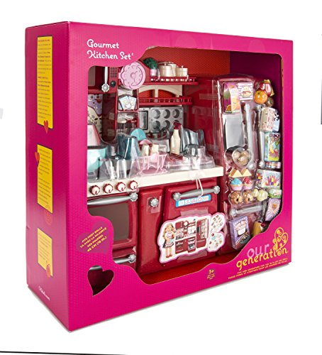• IT'S DINNER TIME! - The Our Generation Gourmet Kitchen Set is packed with essentials and extras and is sure to make a fabulous gift. Your 18" doll can bake muffins and cookie or a feast and clean up afterwards! Not for children under 3 years if age. Please note: dolls and accessories not included.