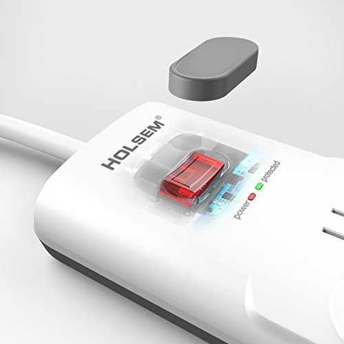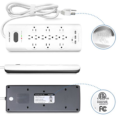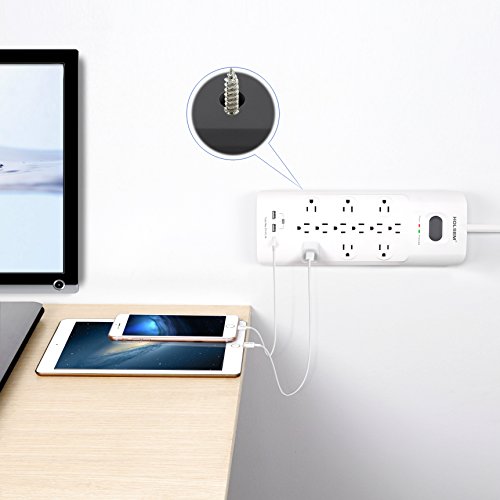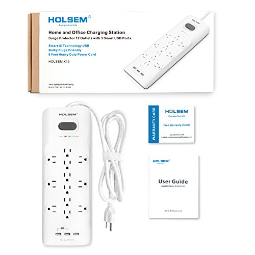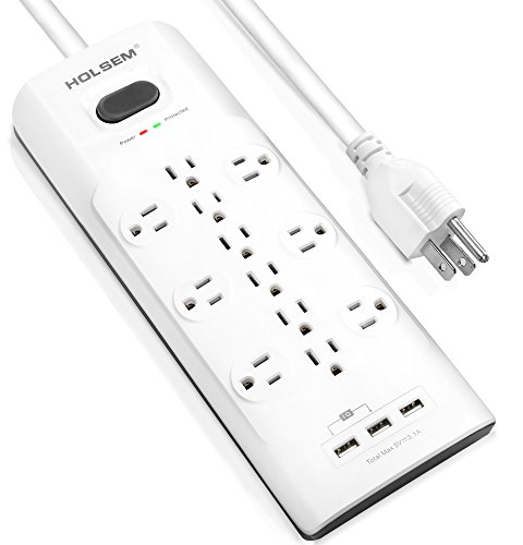 HOLSEM 12 Outlets Surge Protector Power Strip with 3 USB Charging Ports (5V/3.1A) and 6' Heavy Duty Extension Cord, White
