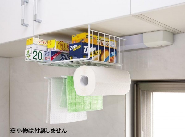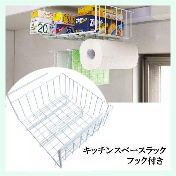 | 吊戸棚の下や引き出しのないテーブルなど、アイデア次第でいろいろな場所に便利な棚の出来上がり♪フック3本付きで、キッチンペーパーやふきん、小物類もきれいに整理整頓できます。 |