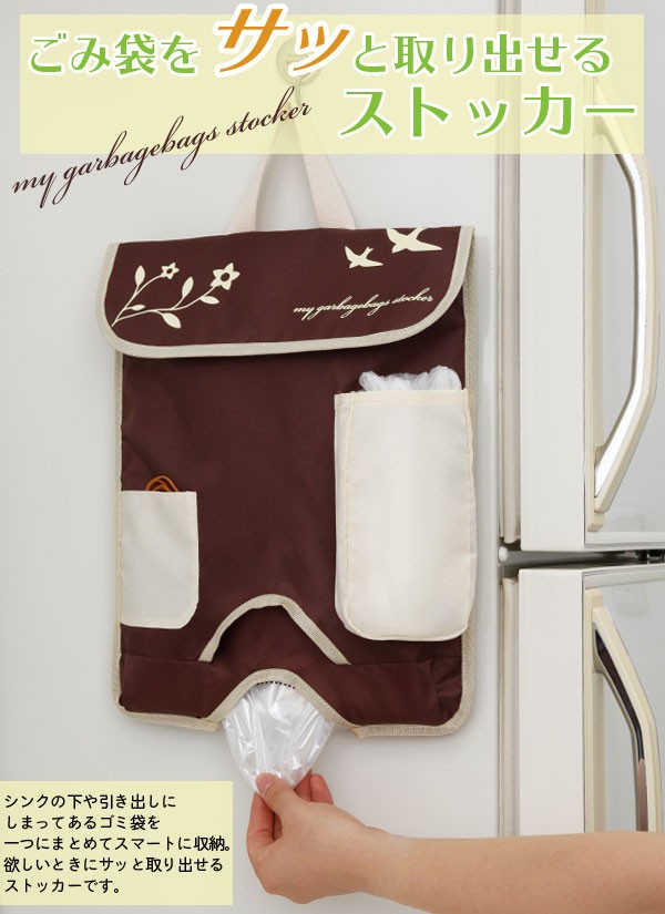 | ごみ袋をサッと取り出せるストッカー。シンクの下や引き出しにしまってあるゴミ袋を、ひとつにまとめてスマートに収納できます。2つに分かれたポケットに2サイズのゴミ袋を収納。必要なときにそれぞれの取り出し口から1枚ずつサッと引き出せます。30L・40Lサイズのゴミ袋に対応。輪ゴムやメモなどを収納できる小ポケット、上から入れて下から取り出せるポリ袋ポケット付き。 |