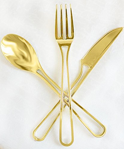 - PARTY SET INCLUDES: This Plastic Party Package Set Includes Place Settings For Up to 40 Persons. Set of Gold Lace Plastic Plates and Gold Plastic Cutlery Includes: (40) 10.25" Lace Disposable Plastic Plates, (40) 7.5" Lace Plastic Salad Plates, (80) Gold Plastic Forks, (40) Gold Plastic Knives, (40) Gold Plastic Spoons